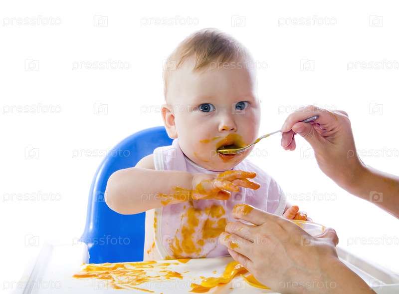 Голубоглазый ребенок ест пюре из тыквы