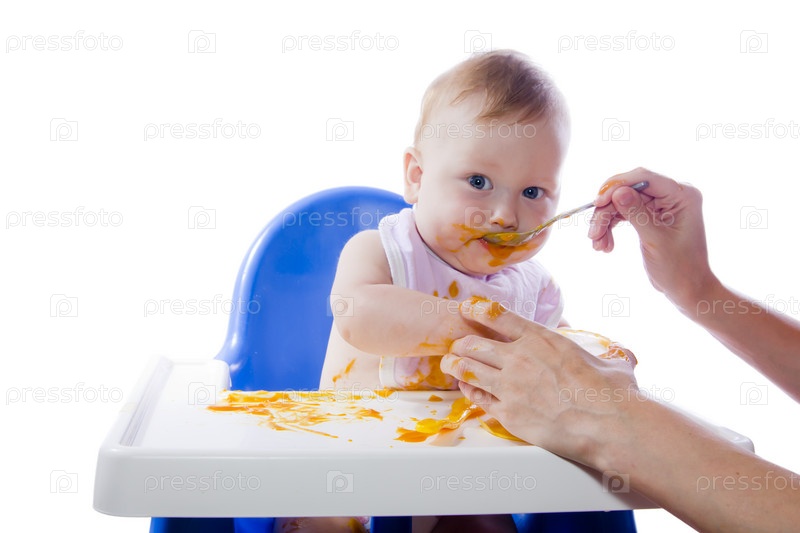 Голубоглазый ребенок ест пюре из тыквы