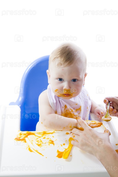Голубоглазый ребенок ест пюре из тыквы