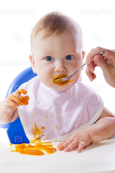 Голубоглазый ребенок ест пюре из тыквы