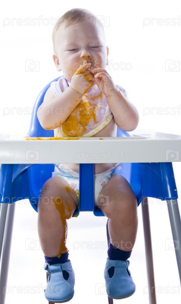 Голубоглазого ребенка кормят пюре из тыквы
