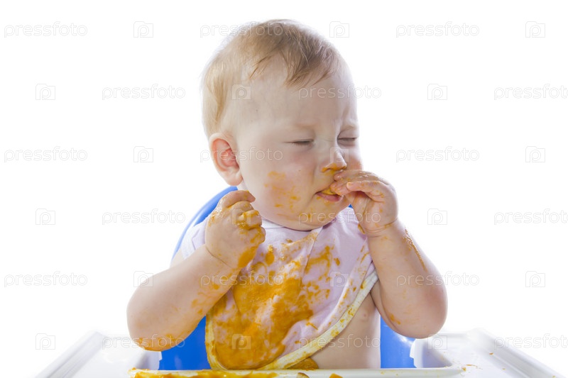 Голубоглазого ребенка кормят пюре из тыквы