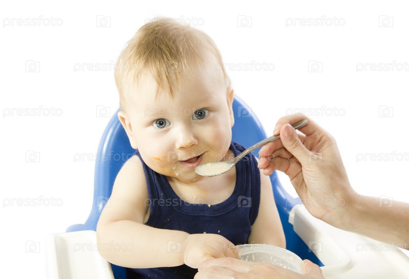 Сероглазый ребенок ест кашу