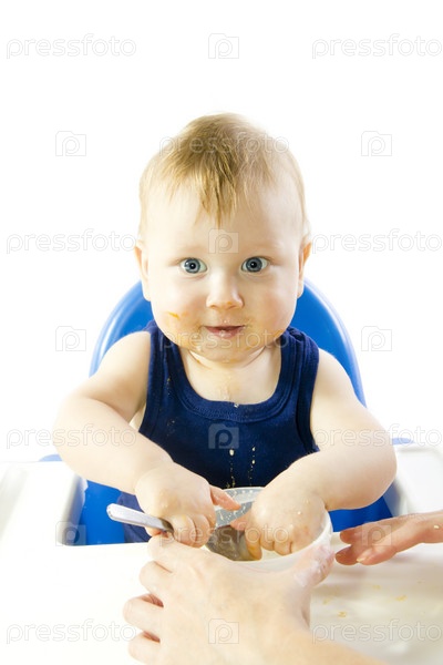 Сероглазый ребенок ест кашу