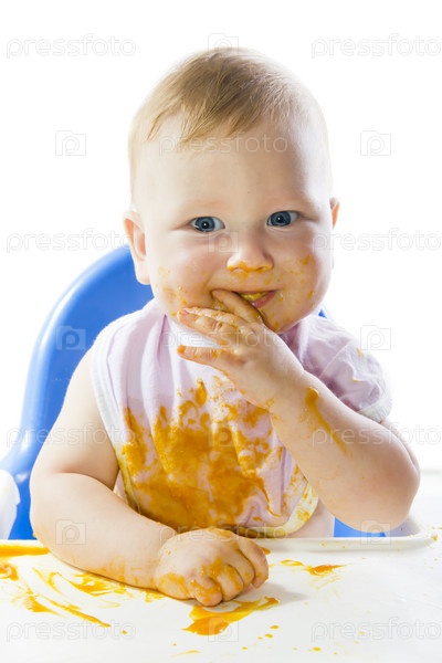 Голубоглазый ребенок ест пюре из тыквы