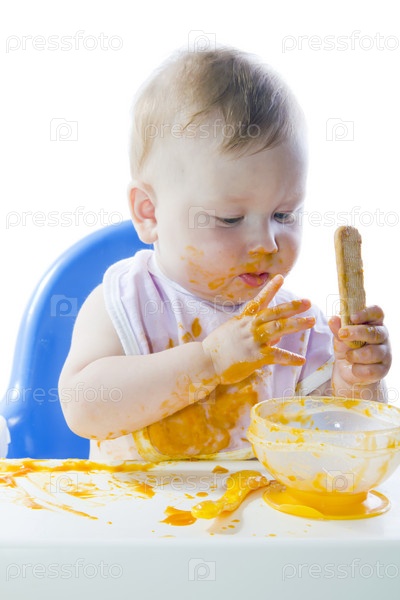 Голубоглазый ребенок ест пюре из тыквы