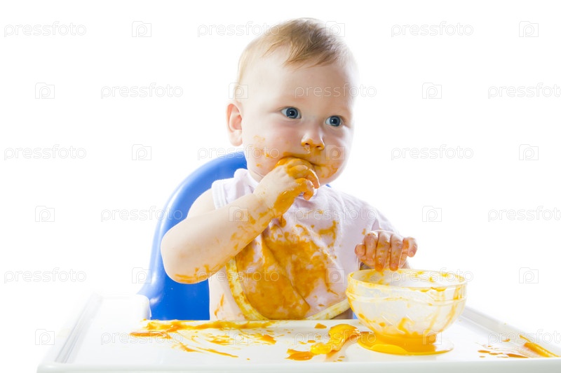 Голубоглазый ребенок ест пюре из тыквы
