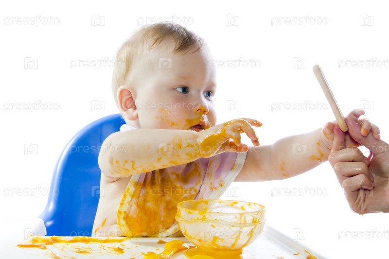 Голубоглазый ребенок ест пюре из тыквы
