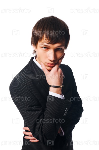 Молодой человек в пиджаке на белом фоне