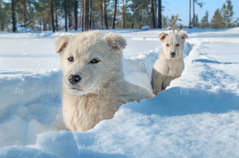 Два щенка в глубоком снегу