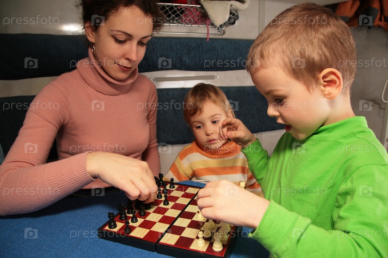 Мать с детьми играет в шахматы