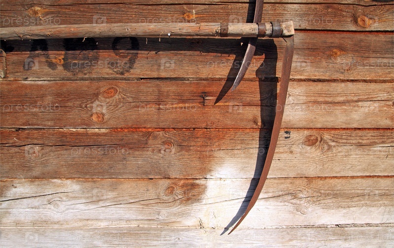 Сельскохозяйственный гранжевый фон. Коса на деревянной стене