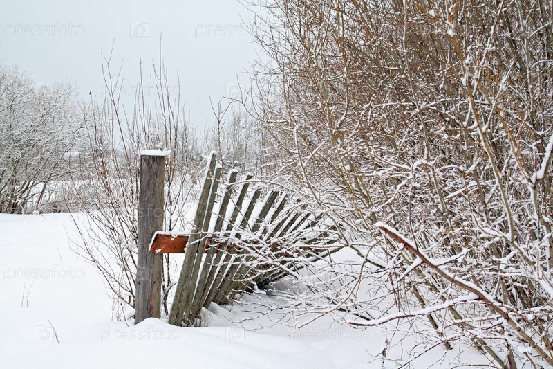 Старый деревянный забор на снегу