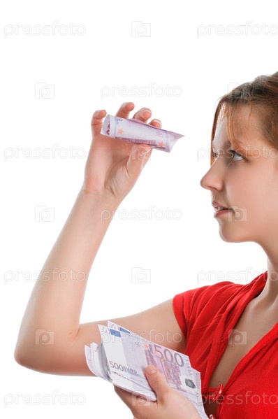 Девушка смотрит в скрученный трубочкой евро