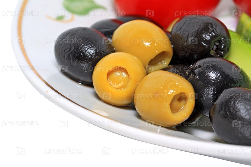 Оливки в тарелке на белом фоне