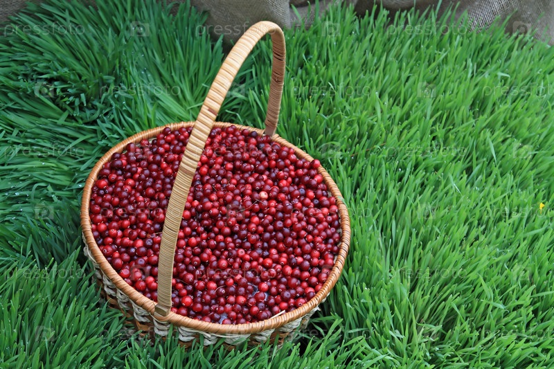 Клюква в корзине на зеленой траве