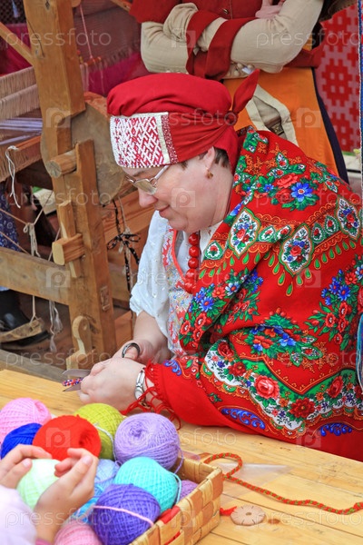 Женщина в национальном платке шьет