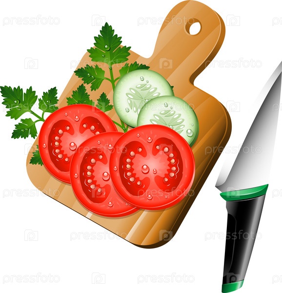Овощи на разделочной доске и нож на белом фоне