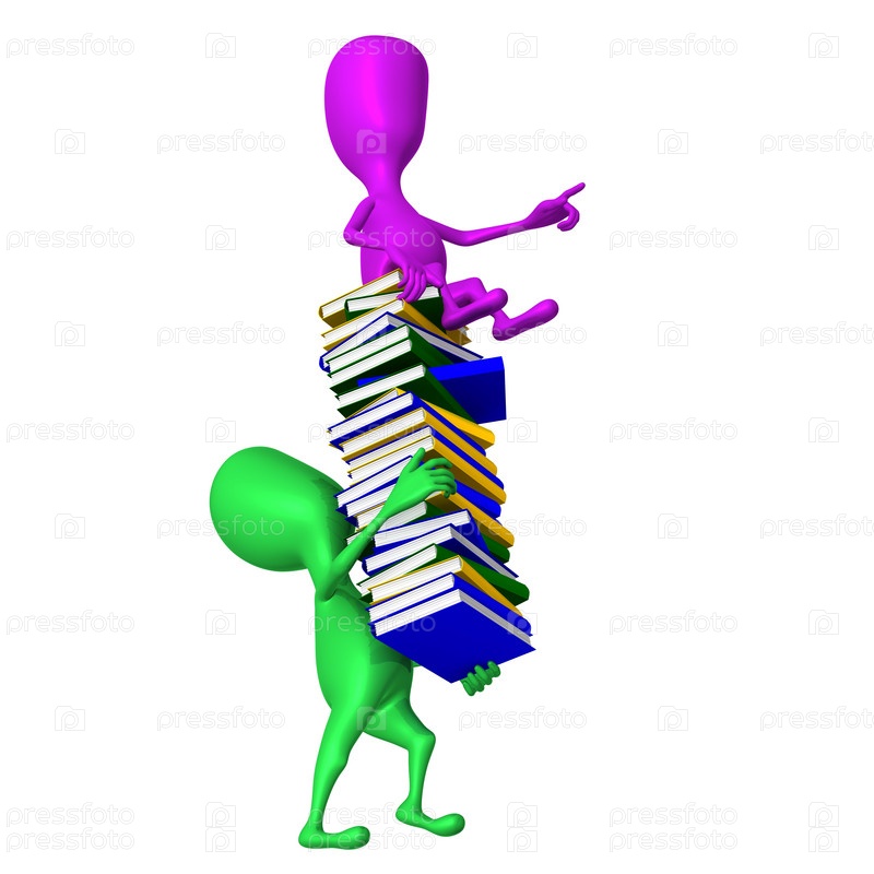 Человечек несет розового человечка на стопке книг