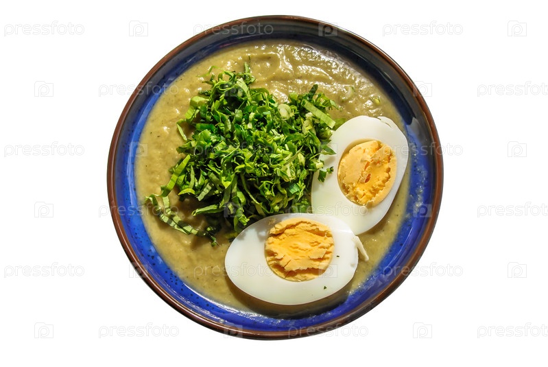 Суп-пюре из брокколи и шпината с зеленым луком и отварным яйцом