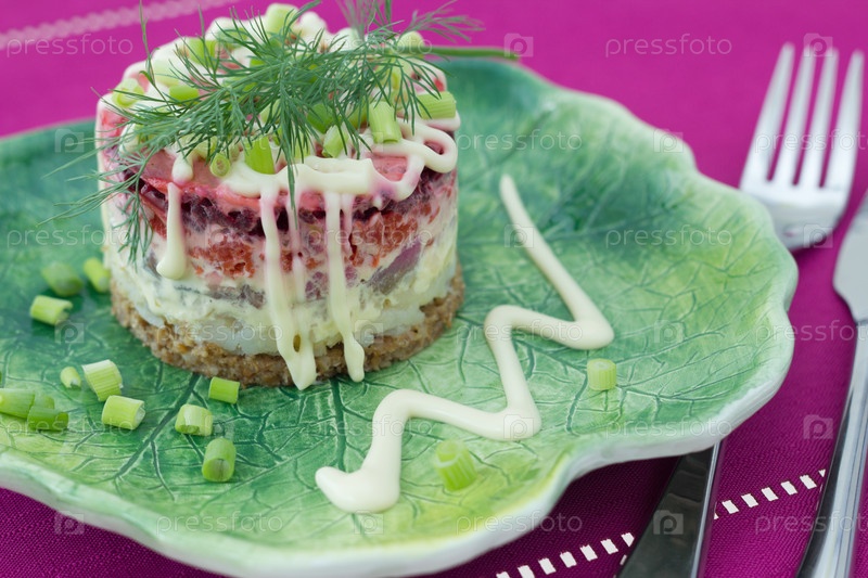 Традиционный русский салат из свеклы и сельди с вилкой и ножом