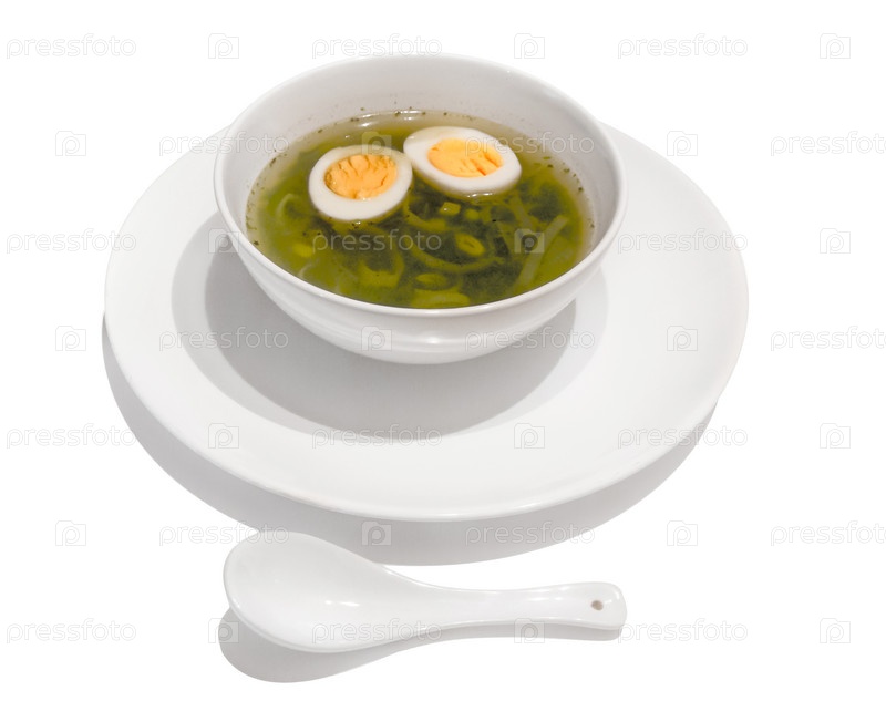 Суп с луком пореем и отварным яйцом на белом фоне