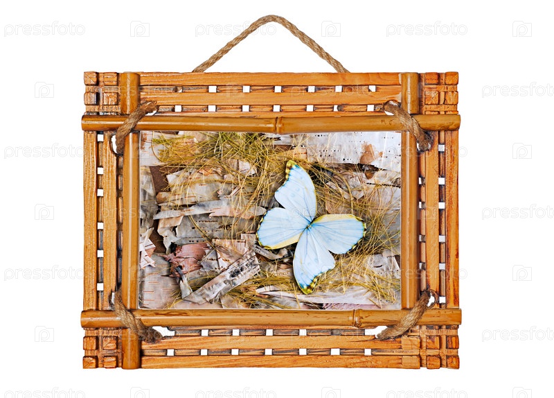 Бамбуковая фоторамка с абстрактной композицией из бабочек, бересты и соломы, изолированная на белом фоне