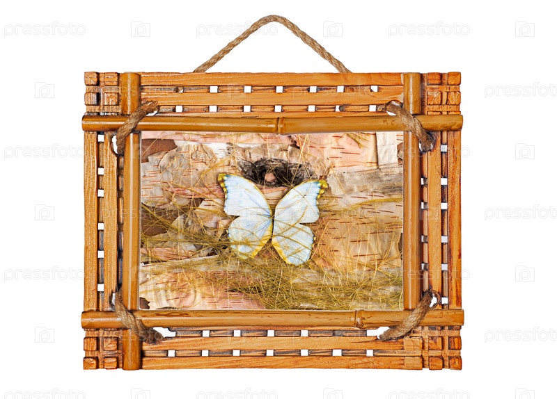 Бамбуковая фоторамка с абстрактной композицией из бабочек, бересты и соломы, изолированная на белом фоне