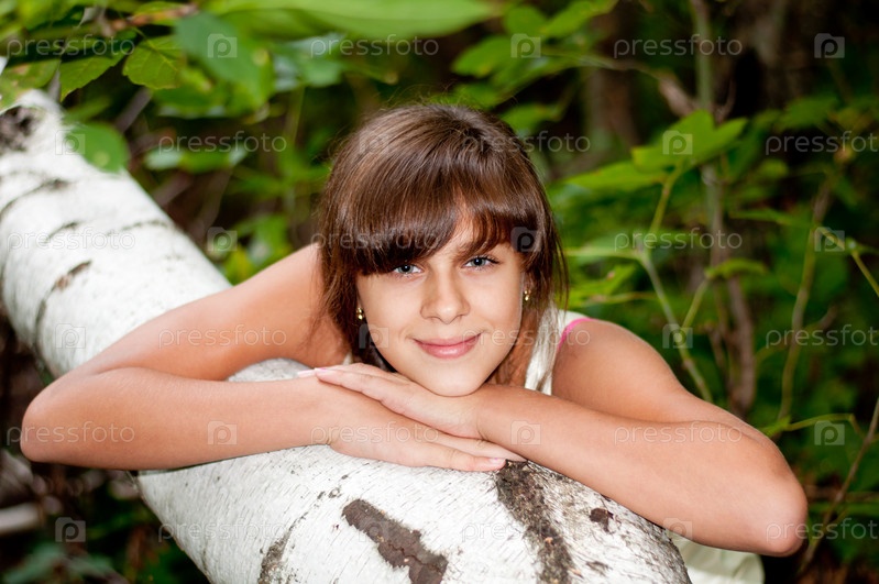 Русская девушка в белом платье в березовом лесу