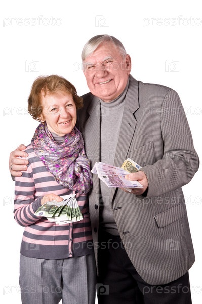 Пожилая супружеская пара с деньгами на белом фоне