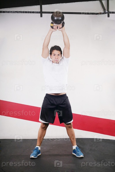 Молодой человек тренируется с гирями в тренажерном зале