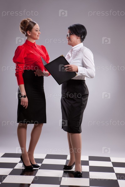 Молодые женщины в стильной одежде на клетчатом полу