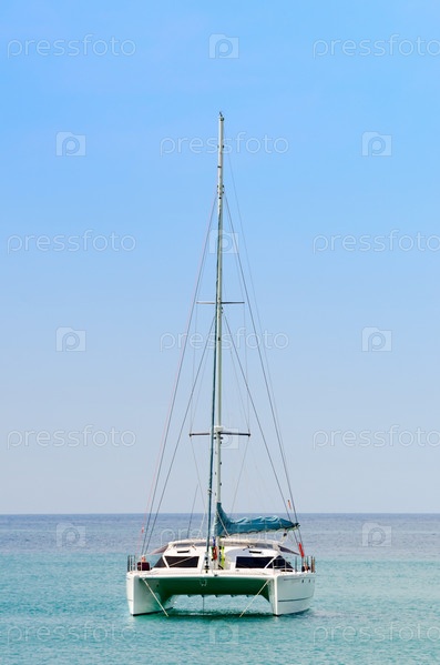 Роскошный белый катамаран под парусом в море