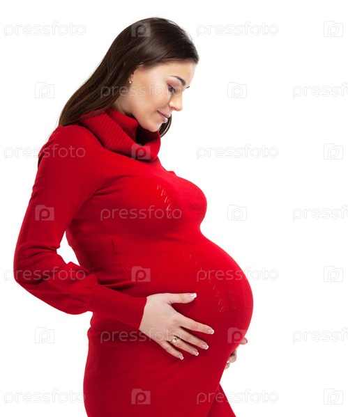 Счастливая молодая беременная женщина в красном платье