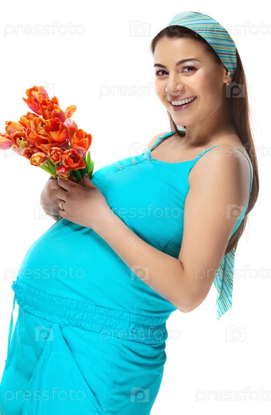 Счастливая молодая беременная женщина в голубом