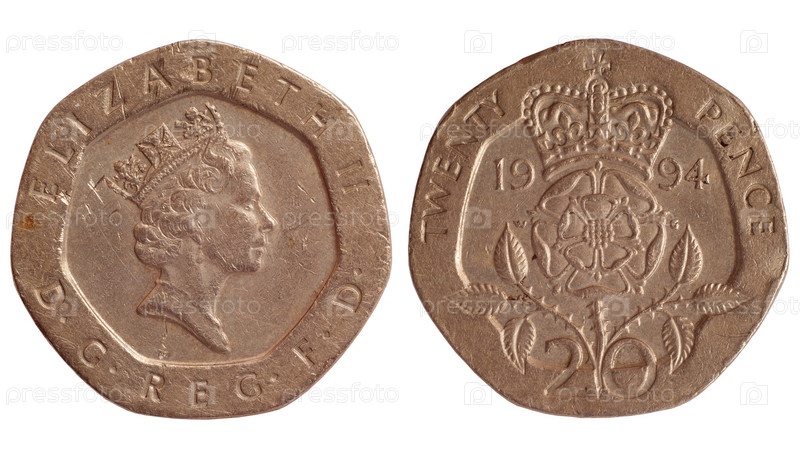 Монеты Великобритании. 20 пенсов 1994 года, изолированная на белом фоне