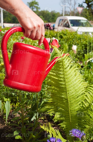 Рука женщины поливает цветы из лейки