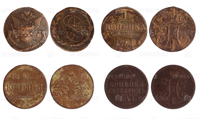 Античные монеты России 1773-1841 года, изолированные на белом фоне