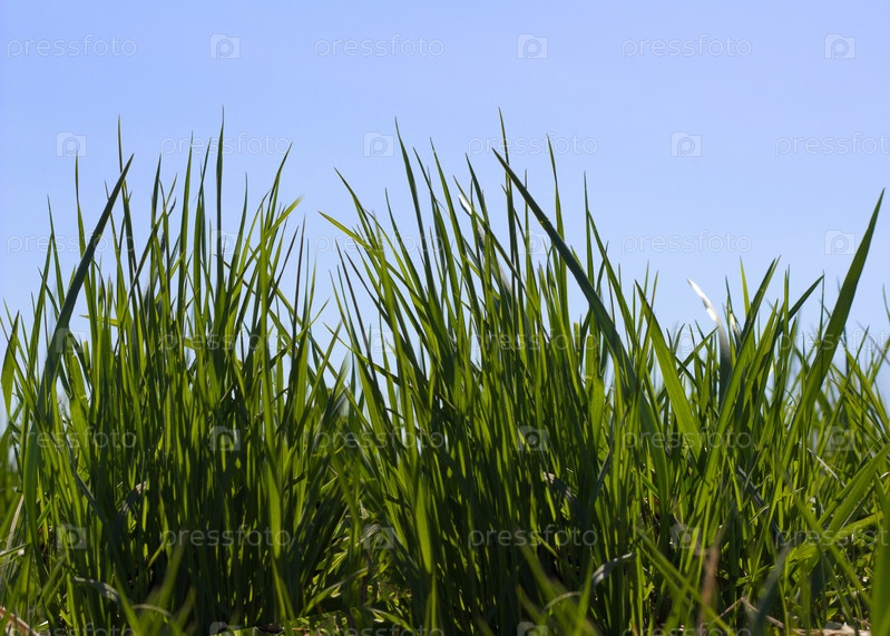 Густая зеленая трава на фоне голубого неба