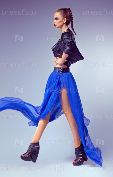 Модная женщина позирует в современной синей юбке