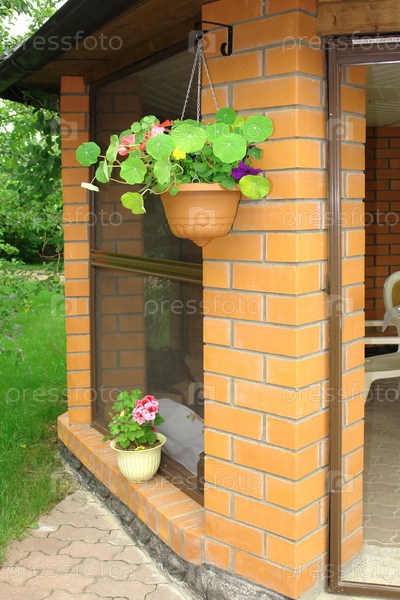 Летняя беседка, подвесные горшки с цветами