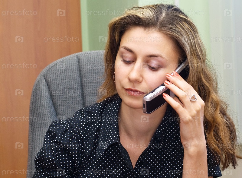 Женщина-предприниматель на рабочем месте говорит по мобильному телефону