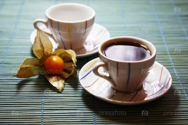 Две чашки на зеленой деревянной салфетке