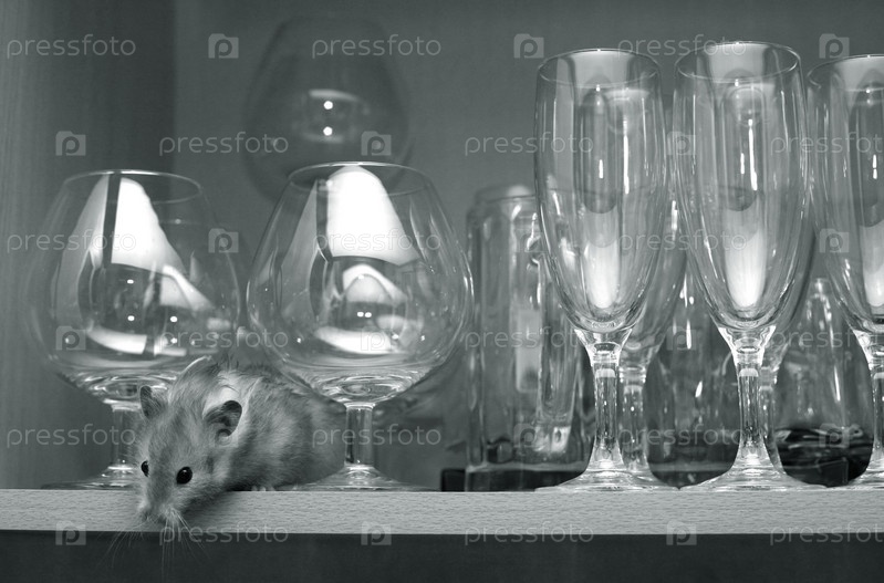 Хомяк на полке с бокалами, в которых отражаются новогодние огни