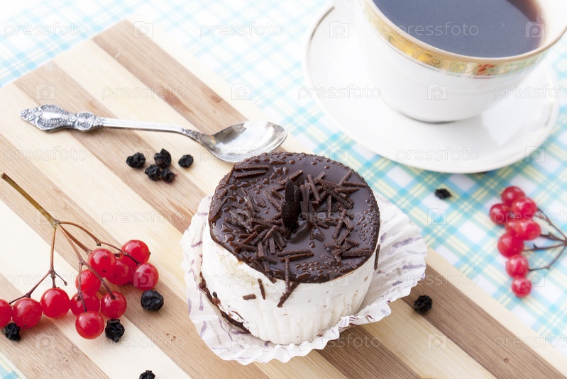 Сладкий десерт. Аппетитное пирожное и чашка черного крепкого кофе