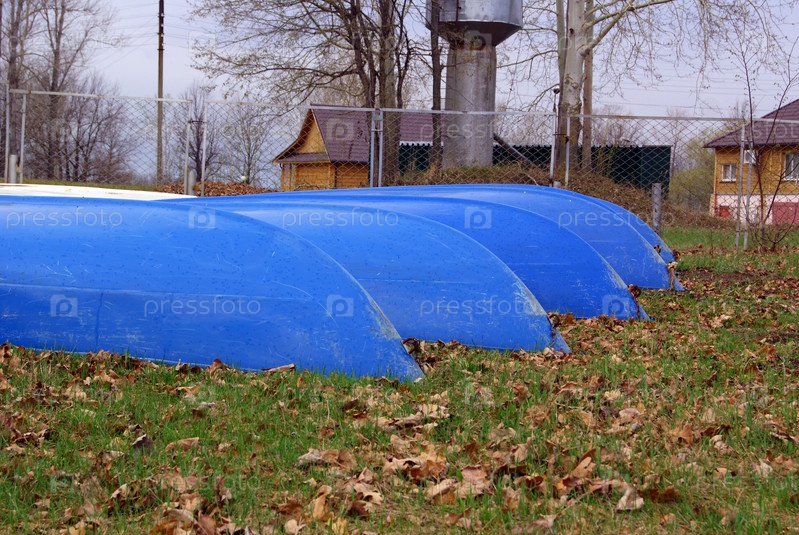 Пластиковые лодки лежат на траве