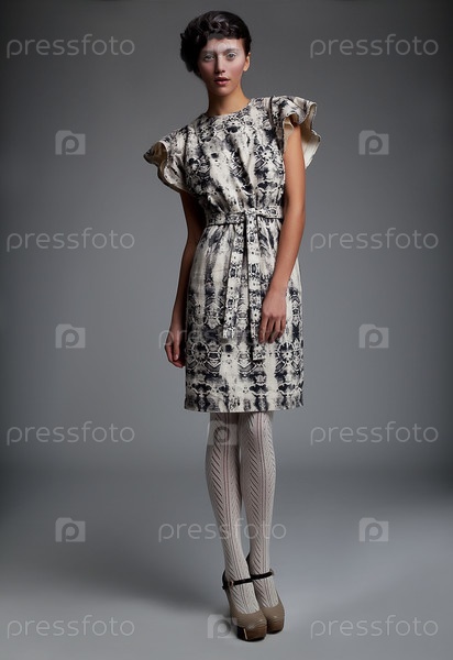 Красивая модель в винтажном платье стоит в студии