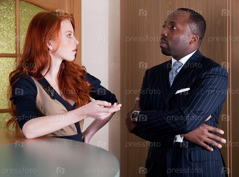 Деловая команда. Рыжеволосая женщина с веснушками и темнокожий мужчина