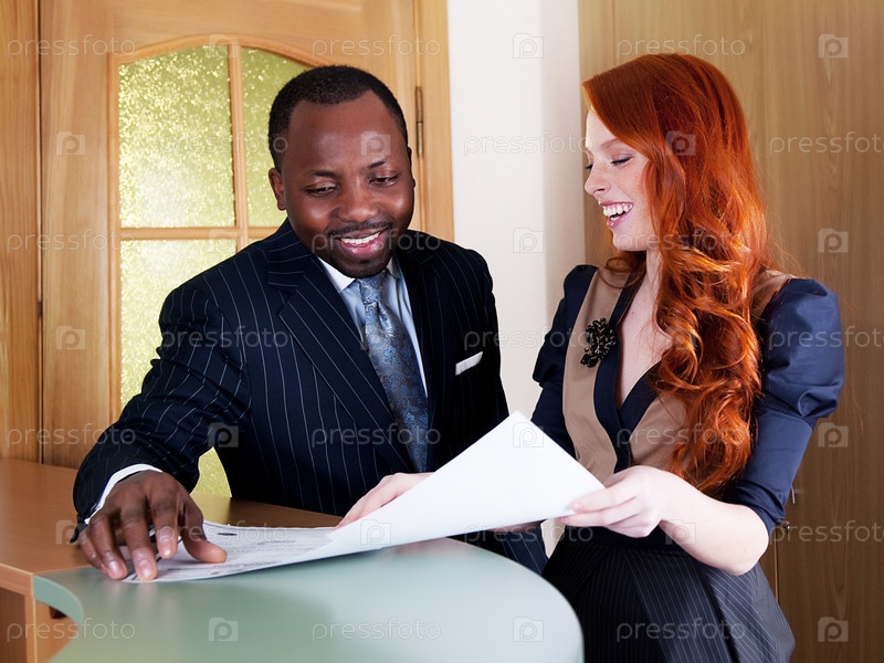 Рыжеволосая женщина с веснушками и темнокожий деловой человек