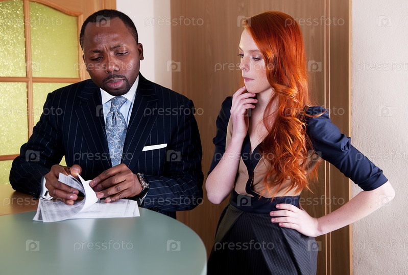 Переговоры между рыжеволосой женщиной и темнокожим мужчиной